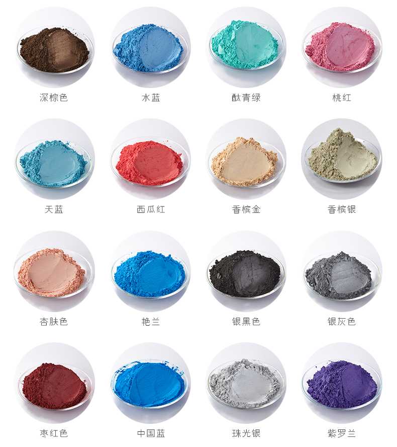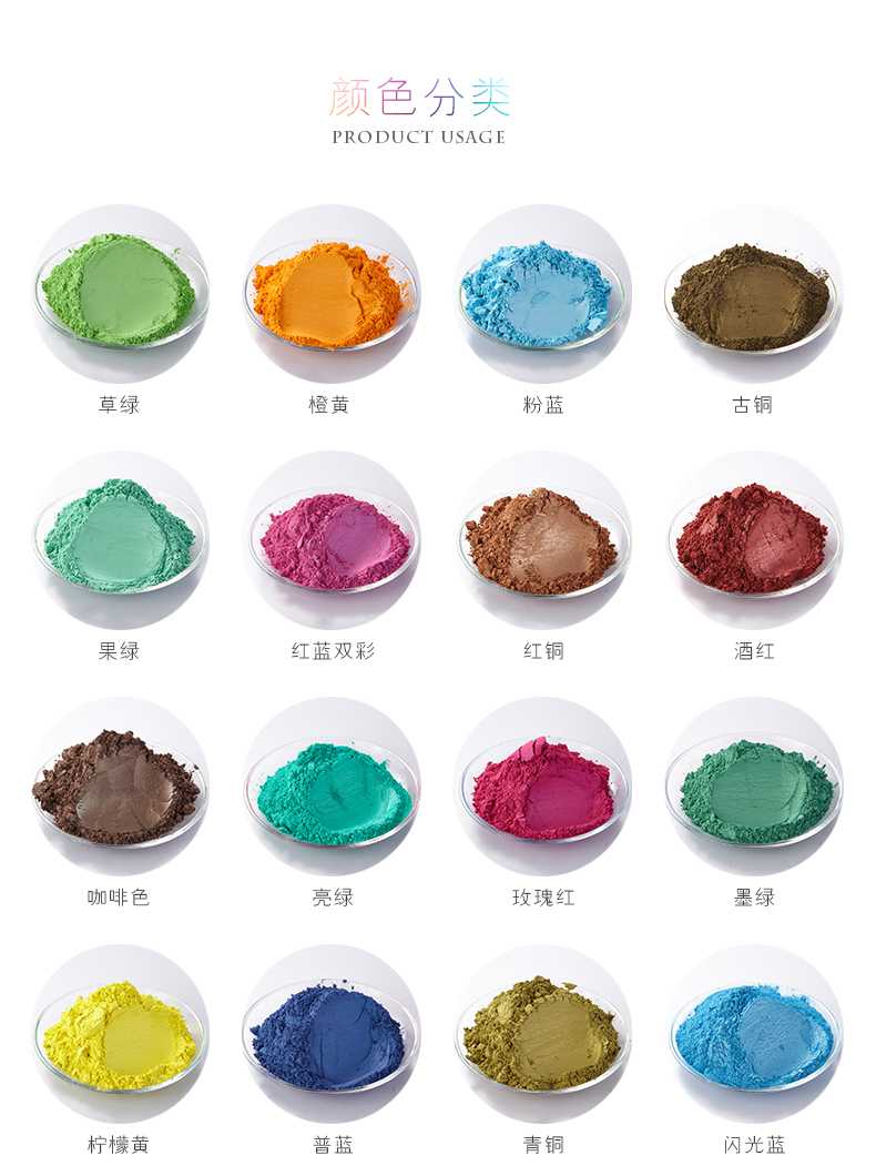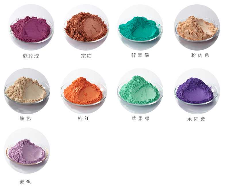 (5)雙色珠光粉系列:雙色系列珠光顏料是在云母表面直接覆蓋一層氧化鐵薄膜根據(jù)氧化鐵涂層厚度的不同生產(chǎn)古銅、紅棕、酒紅、紫紅、紅綠等干涉色,色彩鮮艷、光澤度強(qiáng)、著色力大,盡管其本身是非金屬,卻能產(chǎn)生金屬光澤。
