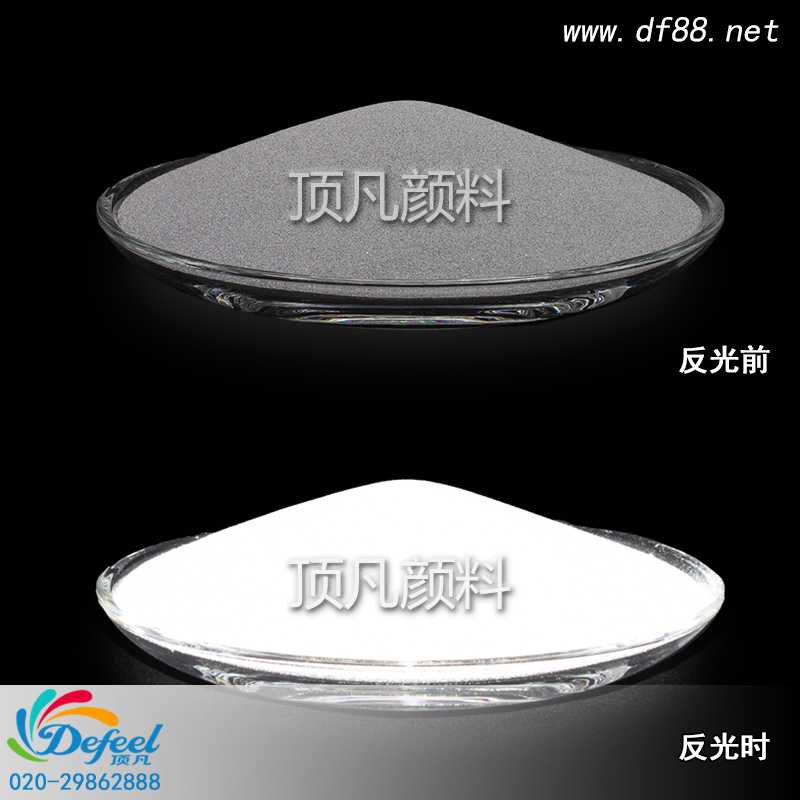 根據用量多少,將反光粉稱量后先用溶劑(環已酮)調成糊狀,然后,加入到透明印花漿料中,調均勻使用。印刷時,印刷的膠層厚度要薄,以30微米~50微米為宜,以確保反光粉能半露在表面,產生反光效果。可以根據用途,采用粗細不等的粒徑,取得各種反光效果。(粒徑不等,反光效果越好)。添加量依反光亮度多少添加。